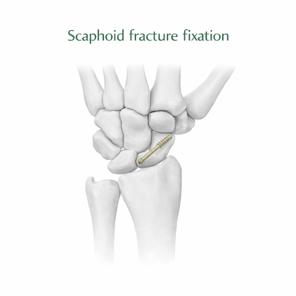 Surgical Treatment: Surgical treatment may be suggested when the fracture is displaced or is present closer to the forearm. Surgical treatment can be either open or arthroscopic. Screws or plates are used to hold the scaphoid bone in place as it heals. If the bone is broken into more than 2 pieces, bone graft (graft usually taken from the forearm or hip) may be used to help in the healing process.